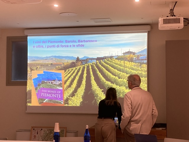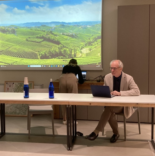 The young women who were setting up the sala were not only ‘cute’ (Marina’s word) but also efficient and technically competent, and David’s powerpoint was safely installed via We Transfer well before Maurizio Gily arrived. He is a local journalist and agronomist who freelances and teaches at the Alba Wine School. (Alessandra from the Torino presentation had suggested him to host)