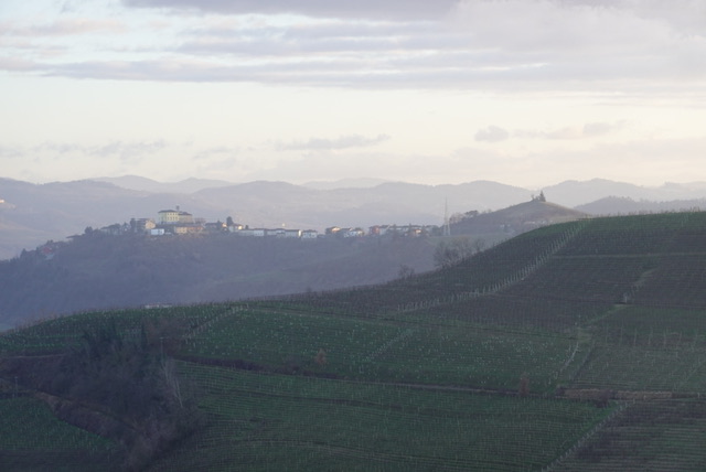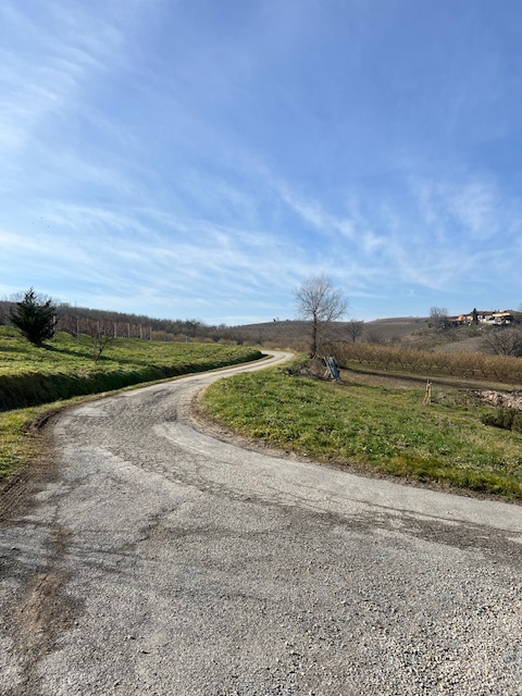 We walked with him up the farm road from the cascina to the crest of the scarp around 480m , from which we could see the vineyards sweeping down on both sides of the watershed; Bricco San Pietro facing west, and facing east, the land sloping down towards Corsini, the landscape dotted with grand houses of the past, the homes of the former owners of their land.