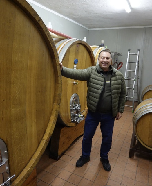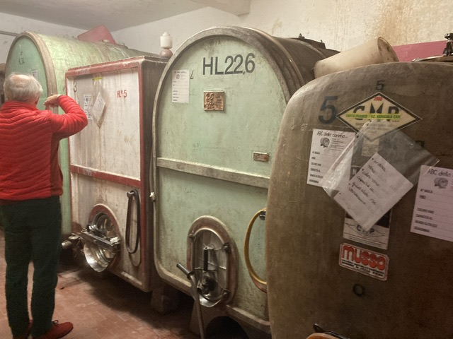 Fitting four of us in what had once been a little tasting room bordered on the comical. Three botti now occupy the main space, leaving a narrow passage along which we shuffled in turn, until two extra chairs were recovered from the tops of the botti, and we shoe-horned ourselves round a tiny table. It became even more demanding when Grazia (who lives next door) arrived; sulky, sour-faced and monosyllabic; keen to eat the nibbles Chiara had prepared. The easy explanation is painful shyness; and the photo-op produced radiant smiles, actually, from everyone!