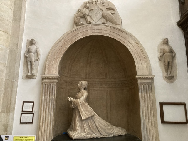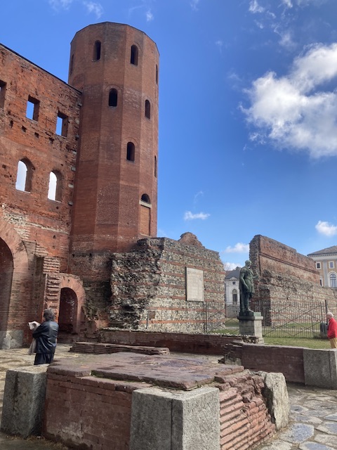 We used an old trick – finding an expensive hotel (one of the Lingotto chain) in which to have coffee and re-group. We had the space to ourselves though the coffee was disappointing! After a quick visit to the Duomo which has a surprisingly light and airy feel despite housing the famous Shroud and too many over-elaborated side chapels. In my view its glory is the (15 tomb of Giovanna D’ Orlier della Balme (1400 -1478) whose stonework is exquisite; understated and delicately decorated, with her women attendants in the dress style of the day. Giovanna was the mother of the Bishop who built the Duomo’s Bell tower.