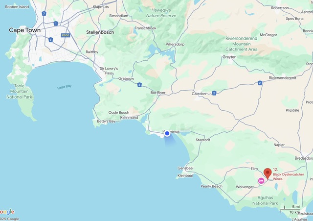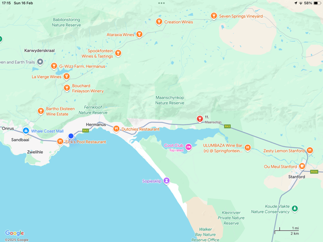 We left shortly before 22.00, Ronnie driving us back to the Port del Mar guest house in Hermanus and making sure we were safely within the gates before heading home. To our dismay, the building itself was locked up and we had an anxious and annoying hour trying every door, able to see our luggage through windows, but with no lights showing anywhere and no-one responding to the so-called after hours number at 23.00 we resorted to phoning a nearby hotel to see if they had a room. We were saved by the young woman standing in for her hospitalised mother at its reception, who despite there not being any space, searched out a personal phone number for our host, and rang him on our behalf.
