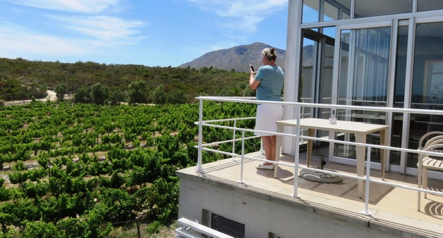We skipped the dessert, to the chef’s dismay, in order not to be too late for La Vierge, expecting us at 14.00. We had already decided to check into our hotel and leave luggage as we drove through Hermanus, so Ronnie warned them of our tardiness. Fortunately the wine-maker was also delayed, so we were able to draw breath in their tasting room and admire another wonderful view across the Hemel en Aarde valley towards Newton-Johnson and Bouchard-Findlayson vineyards.