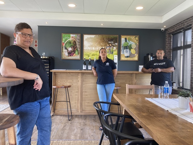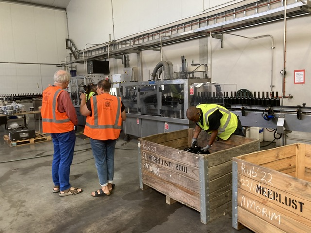 Compagniesdrift – is a storage facility and Wine Shop set up as a social project (part of the Black Empowerment initiative) by a neighbouring large wine company, and which is managed by Ilise Ruthford and owned by the estate workers. It is a struggle, of course, to make the business work, and Ilse is keen to concentrate on the storage component, which is slowly expanding. Ronnie is at the far right of the first photo below