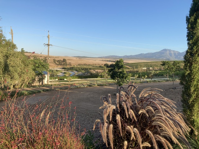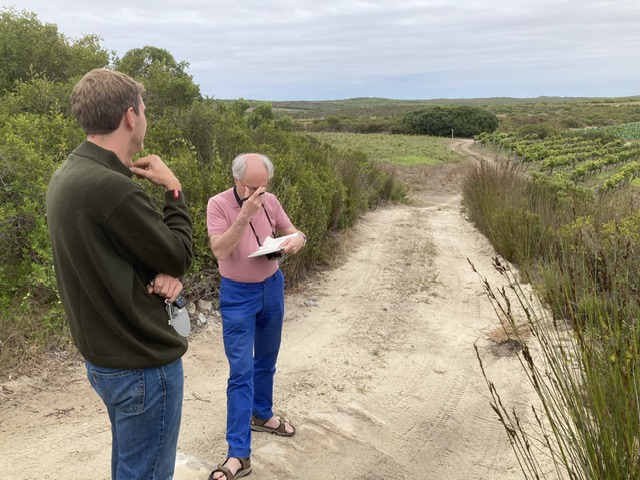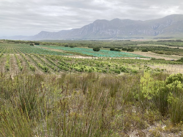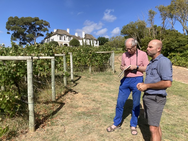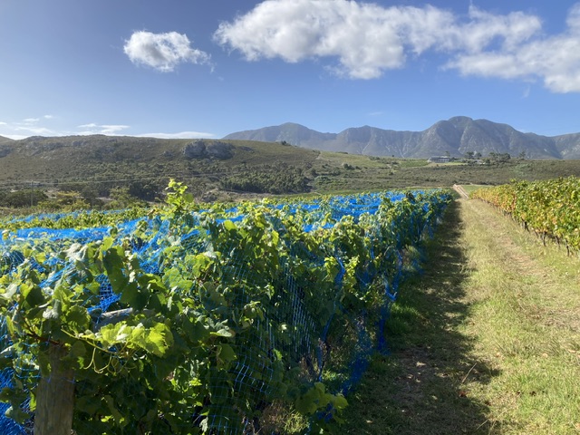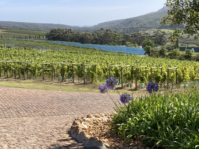 This winery overlooks Bouchard-Finlayson, where Lizette Kuhn greeted us warmly at 15.45 and walked with us to the immaculate vineyard alongside to speak with the Farm Manager, who gave David a full account of the practicalities facing them. The single-use, recyclable blue netting is (at the moment) successfully fending off the most problematic and numerous birds – alien starlings, whose murmurations entrance as well as menace. The smaller indigenous birds still manage to wiggle in and out!