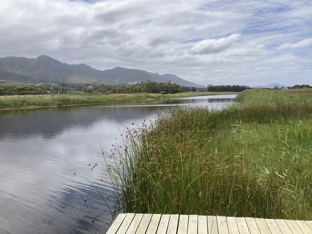 His son, Emil, a gauche 30 year old with an engineering background, took us to the spring itself, and then onto the crown of the peninsular with views out to sea and across Walker Bay, into which the river flows when the lagoon is breached. We drove through the fynbos down to the river, to the double height jetty (to cater for the occasions when the water levels of the lagoon become tide-affected) to what Emil described as a wildlife paradise. It is certainly a relatively untouched, and sensitively managed environment.