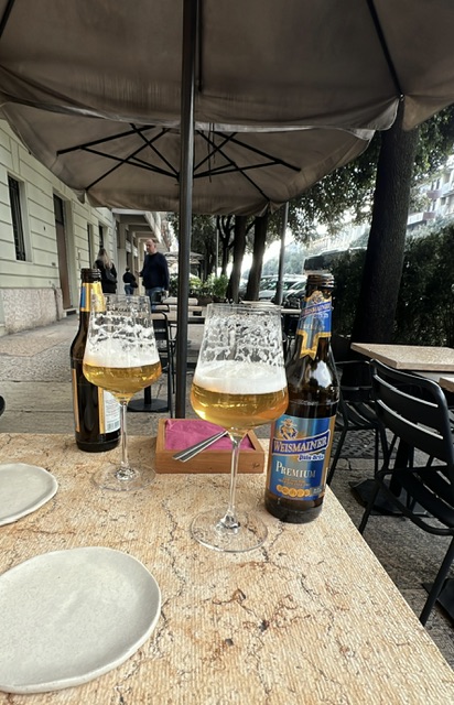 We ate on Sunday night at Con Amore – a tiny ristorante with quite limited appeal; and on Tuesday at L’Altra Colonna, and on Wednesday night at Il Condominio (where the waitress tried to coax her clients with a free Prosecco into surrendering their phones in the interests of conversation… ) And we paid a couple of visits to Alberto’s Enoteca just along the street, to enjoy a beer.