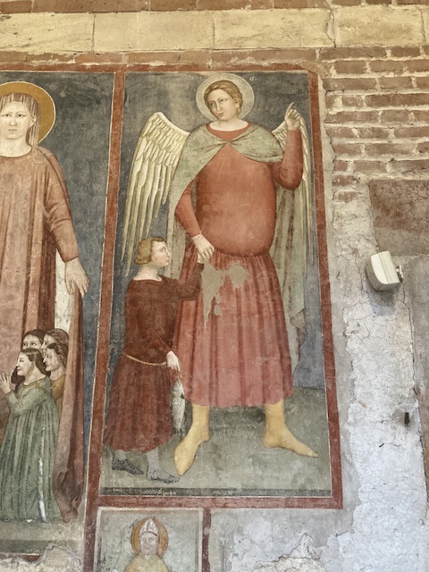 It was in this place in 2018 that I witnessed a large group baptism performed by a very talented parish priest, who presented each candidate to the Sunday congregation with such bravado. A young Zeno nearly brought the house down! Below is a wonderful fresco of Tobias and the Angel Raphael, and the bell tower.
