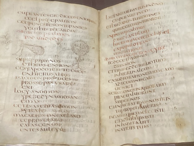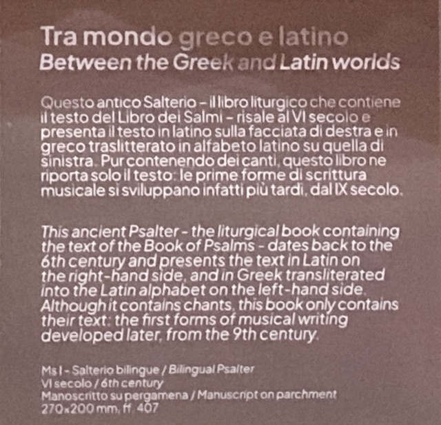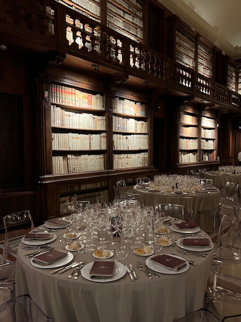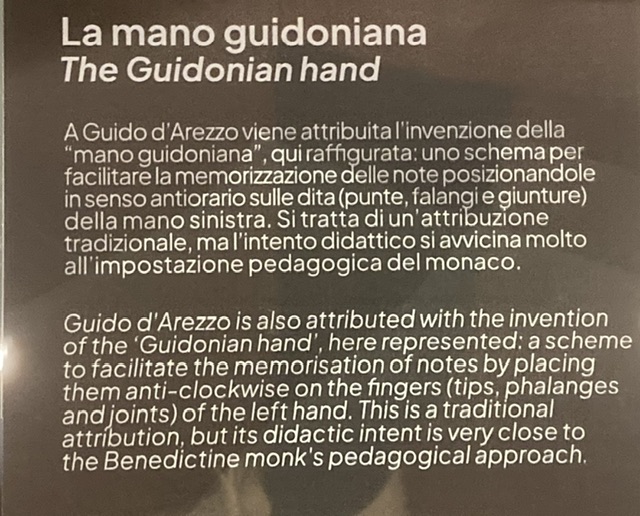 It was a remarkable occasion, if slow, with nearly a hundred seated guests, celebrating a change of direction (and re-brand) by Tedeschi, using the grand main room upstairs. The Biblioteca also houses what had been a private collection of largely Italian art and historical artefacts, whose displays were visible en route to the loos. Most notable were the illustration of early musical notation and a bound copy of biblical text, in latin on one side of a page, and opposite the greek text (albeit transcribed in Latin alphabet!) and a drawing of the Guidonian Hand, devised to help memorise notes….