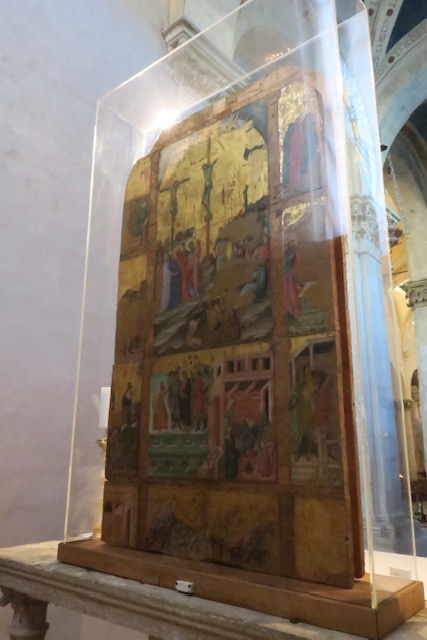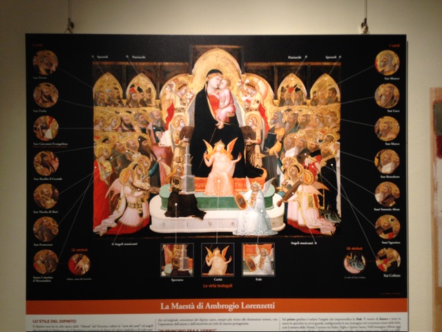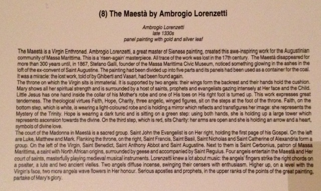 Nor was his Maestà, which we have seen in the Gallery in Massa Marittima. What follows are photos taken at its exhibition of Ambrogio’s work executed in the Maremma area, 50 km to the south of Siena. It is remarkable that there are so many astonishing pieces still to be found in the places for which they were painted, more than seven hundred years ago.