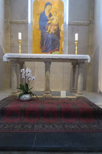 Last, but not least, is a fourteenth century painting : the Madonna delle Grazie of 1317 ascribed to Duccio himself, with panels on its rear side reminiscent of the great Maestà in Siena. It stands as a reredos for the North Aisle altar, a focus of devotion still, and decorated with flowers. Extraordinary!