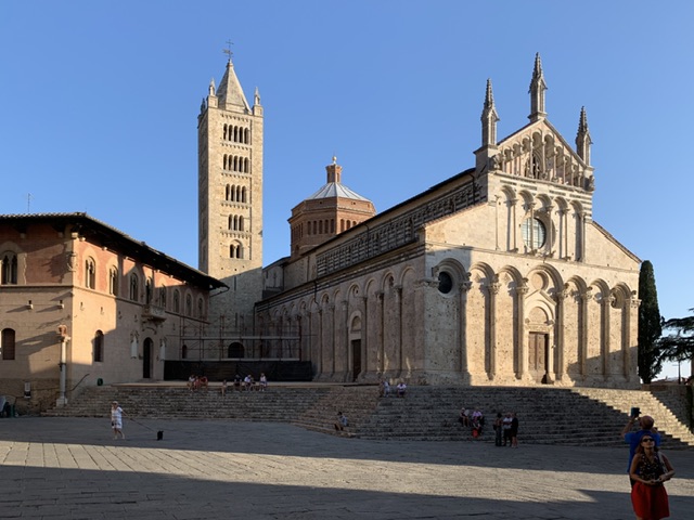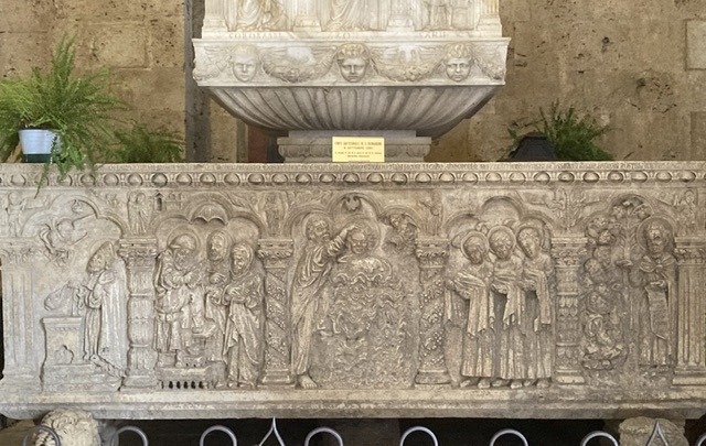 Massa Marittima’s fine Art Gallery has a wealth of material from which we can deduce how widespread the impact and influence of the Sienese art of the fourteenth century was throughout Tuscany. And the Cathedral of San Cerbone still contains today a number of outstanding pieces: the baptismal font in which San Bernardino was himself baptised; and behind the High Altar, the tomb carved in the twelfth century to house the remains of San Cerbone, with its carvings of the miraculous, and some glorious contemporary touches – its marble ‘cathedra’ or bishop’s seat, and supporting its altar, some very life like tortoises…