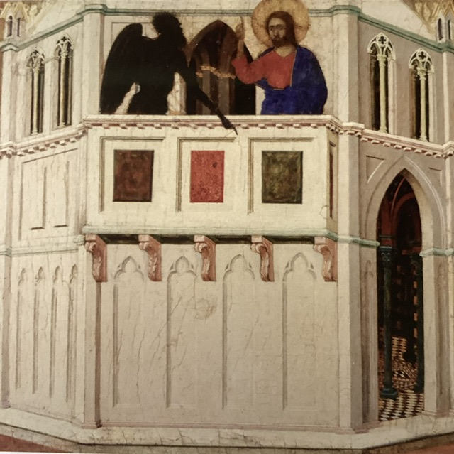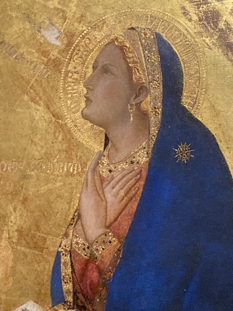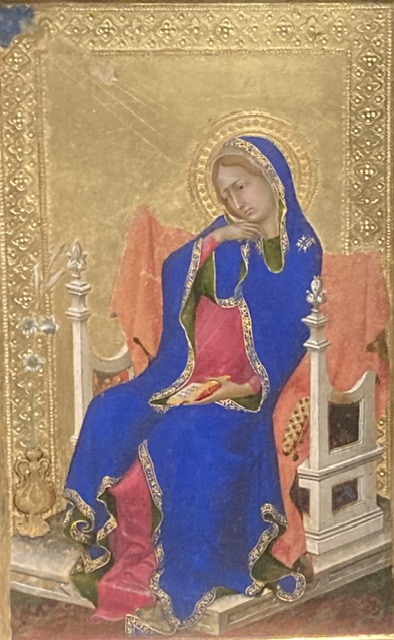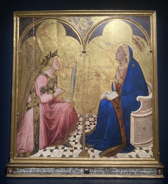 Siena claimed Mary, mother of God, as its champion in heaven and on earth, attributing their unlikely success in 1260 at the famous battle of Montaperti against a much stronger Florentine army to her intercessions.) Ambrogio’s painting The Annunciation (1344) above was a civic commission by the tax office!