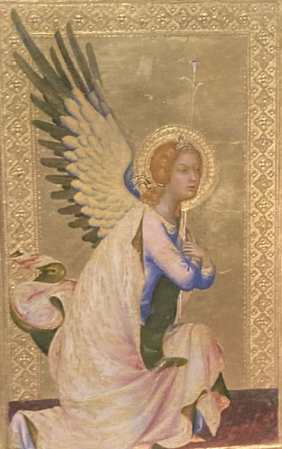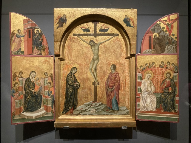 Its two sides carry very different themes: the Annunciation and a Passion cycle. It is perhaps a free-standing, miniature, double-sided altarpiece, a distant echo of Duccio’s Maestà.