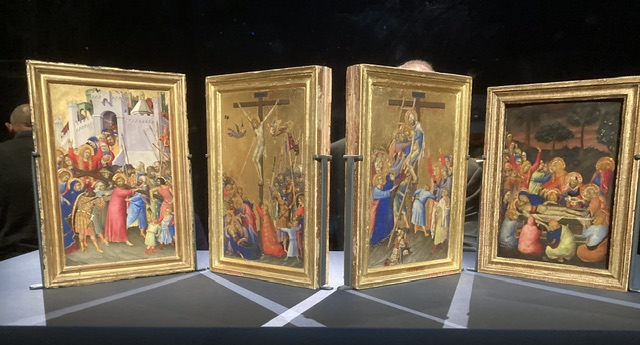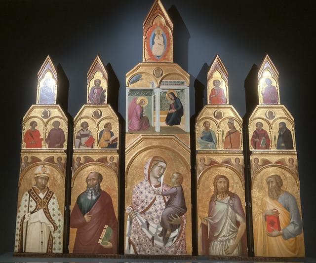 Many pieces in this exhibition were small, portable objects used as devotional aids by the many pilgrims passing through Siena as they followed the via Francigena to or from Rome. Other exhibits were much larger, and some were re-united for the first time for many centuries, having been broken up, sold, sometimes stolen, and carried off across Europe.