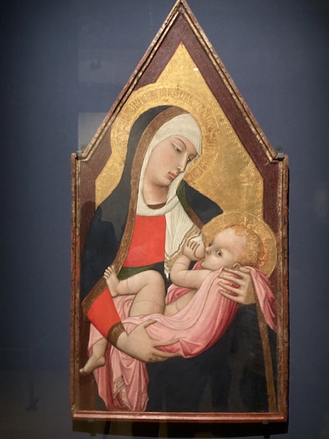 The exhibition contained many other pieces to illustrate the wealth of artistic expression to be found in Siena at this time; too many to celebrate here. But some mention should be made of the work of Ambrogio Lorenzetti, a younger brother of Pietro, who produced extraordinary work, some of it for secular authorities as well as religious patrons. Above is his Madonna del Latte painted c 1325.