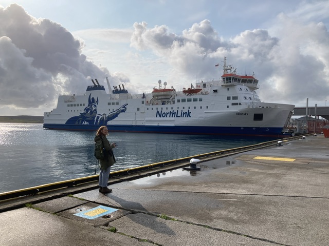 First stop at 23.00 was Kirkwall on Orkney; by 01.00 the decks were quiet. We had a pretty gruesome night ( not sea sickness – but pods are very unsatisfactory – Hugh slept on the floor of the main deck and I stuck it out in the pod… ) Food was OK; beer better. (Note for next time: get a cabin, or fly!)