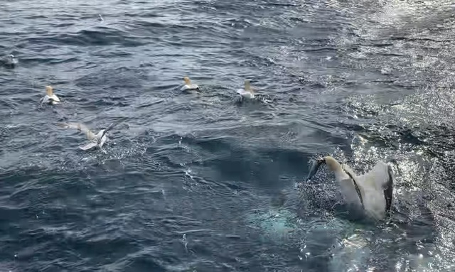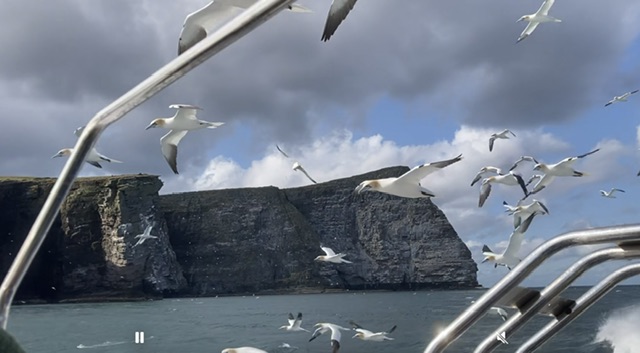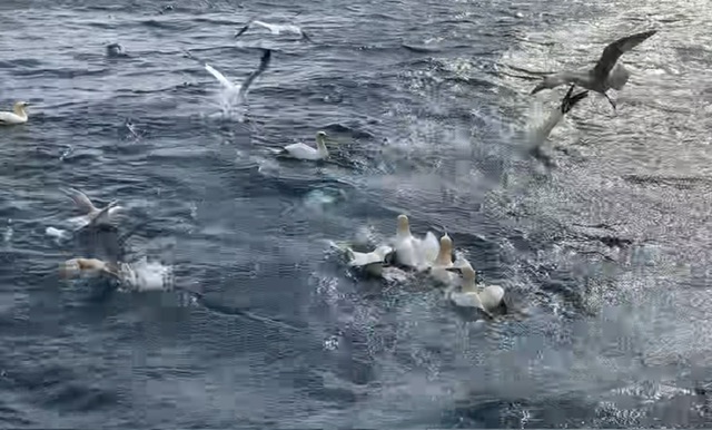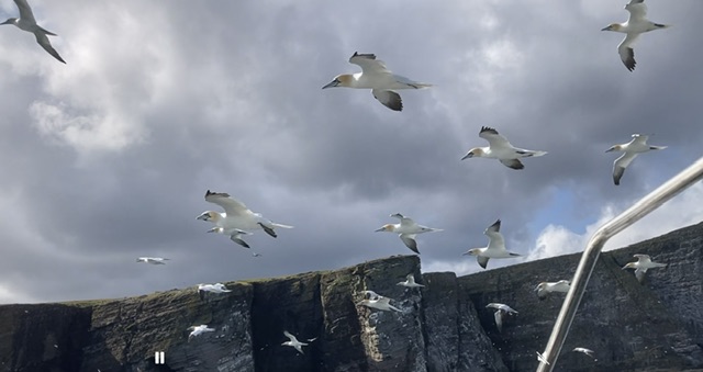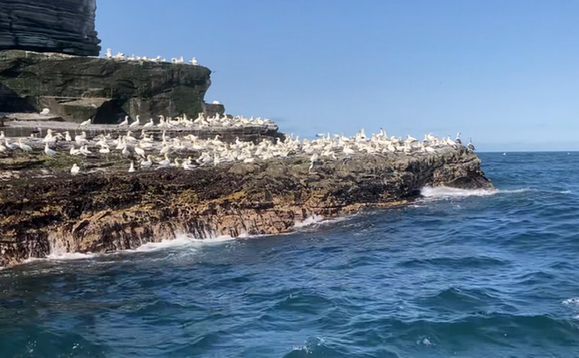These outings are undoubtedly popular with the birds: on the return journey they escort the boats in their hundreds in order to dive for the fish liberally thrown for them. It was an impressive sight – but not as gripping as the sights and sounds of their nesting cliffs, photos of which will follow on Tuesday.