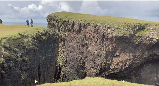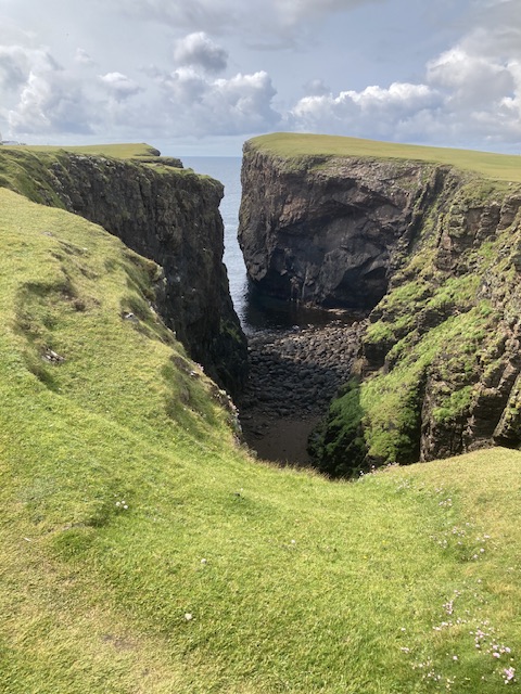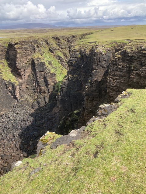 The weather cleared as we walked on to see the Eshaness Geo – a massive ravine, running at right angles from the cliff line for 100s of metres. A former colleague tells me that ‘a Geo is formed on high-impact coastlines where waves exploit weaknesses in rocks that are aligned in bands along the coast. In some cases you may get a cave, but the geology here means that they collapse before they form’.