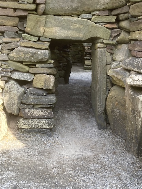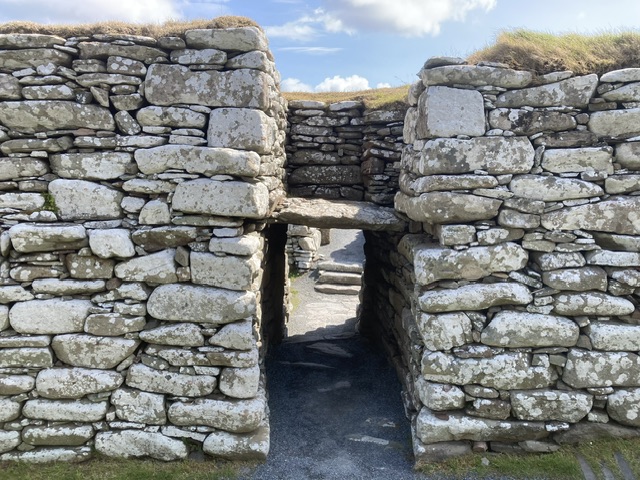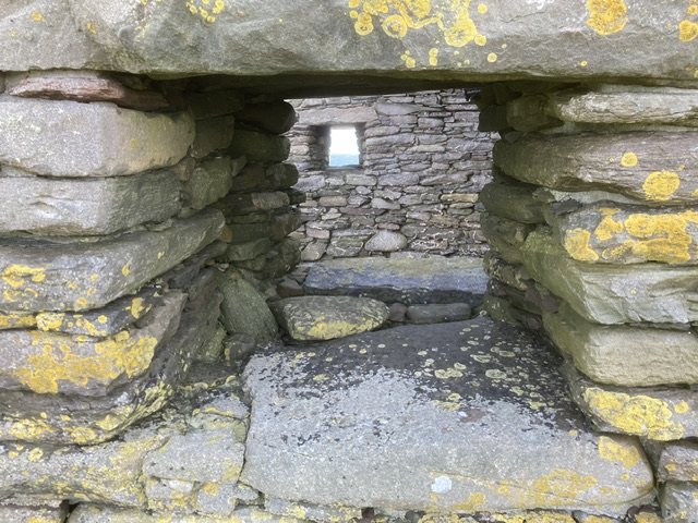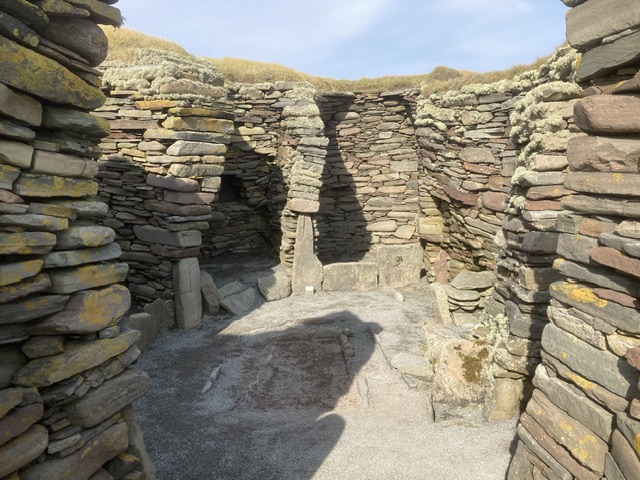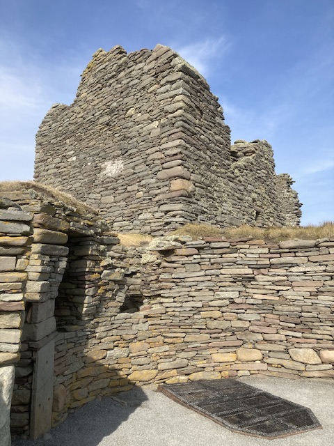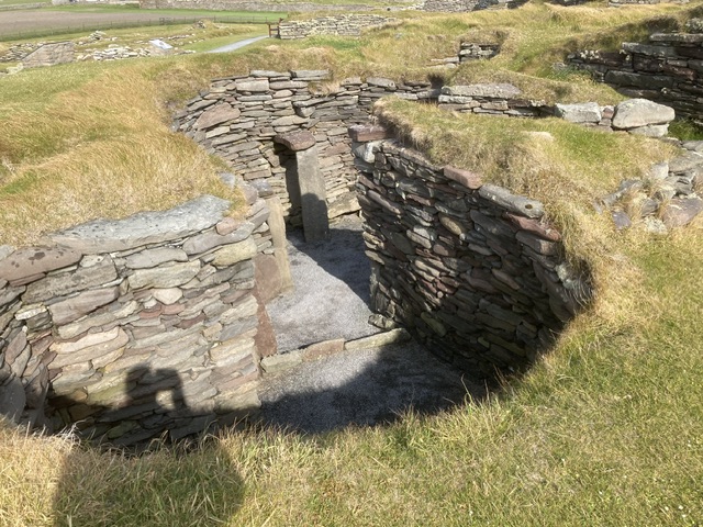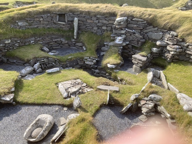 We returned to Sumburgh in time for some of us to visit the Jarlshof archaeological site alongside the hotel. Neolithic people first settled here around 2700 BCE, and it remained in use until the 1600s CE. A great storm in the late 1800s uncovered evidence of extensive settlement, and as the site was excavated it became clear that the domestic and defensive arrangements of many different eras were represented.