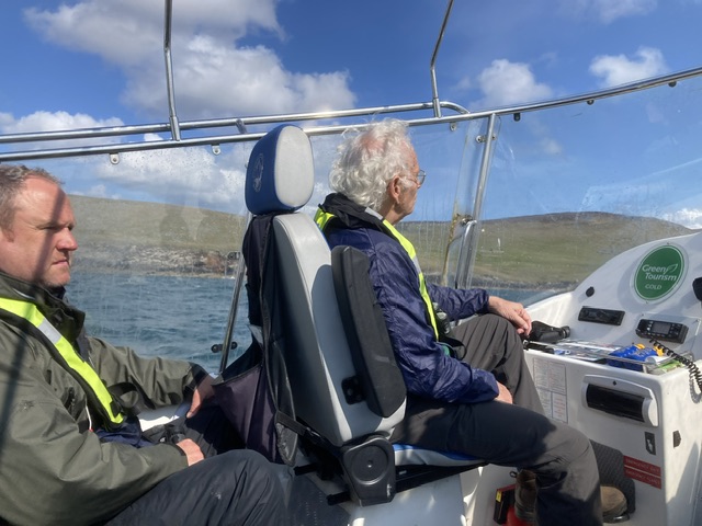 It was a wonderful day with spectacular sunny weather, even if the wind kept temperatures in the low teens. Boat journeys require many layers: I wore six for the nighttime Mousa boat, but only four today!