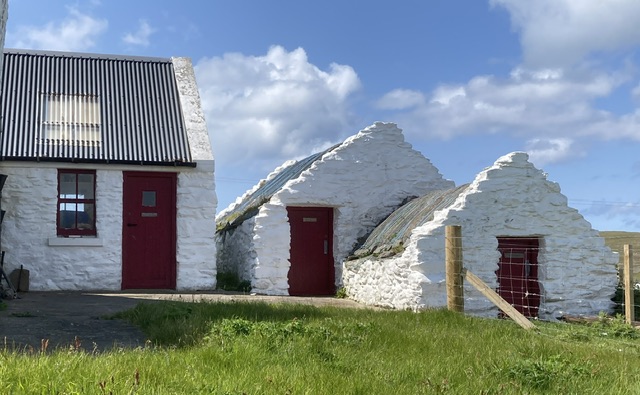 We moved on to a small settlement called Duncansclett on West Burra to the south of Scalloway, where several old houses or crofts remain; one or two still under thatch (reed, not straw) but many now under corrugated iron. Alongside was a good example of a popular style of pre-fabricated building seen all over Shetland made from cheerfully painted overlaid wood; in this case, red.