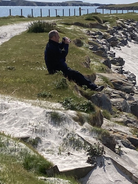 We drove south, the length of Yell, to examine inhabitants of the Loch of Littlester, and on to Burravoe where Mark’s botanical training led us to various orchids, spring squill and ragged robin.