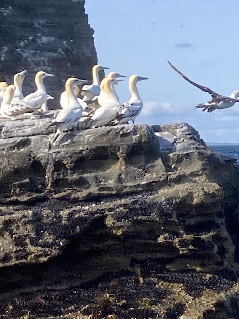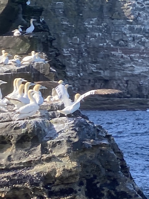 It was a spectacular sight. This boat repeated the throwing of fish to the accompanying gannets as we made our way into quieter waters, for a cup of tea (vacuum flasks) and some local history. Yes, Shetland ponies were bred and raised on this virtually uninhabited island, and yes, after they had been rounded up and haltered, they swam the Sound as a herd, towards the mainland, to be shipped to Tyneside to work in the coal mines of County Durham.