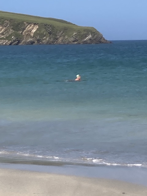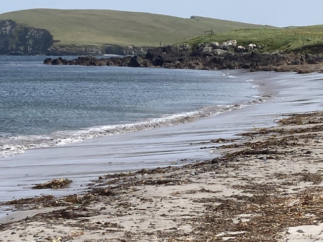 We moved on to one of the better known sites on Shetland : St Ninian’s Bay which was enchanting. Here we saw at least two intrepid swimmers (human beings) without wet suits, several birders and walkers, and glorious sands where the sea ebbs and flows on both sides of the isthmus.