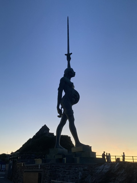 We settled into our friends’ delightful flat in Granville Point, formerly a hotel with a fine position overlooking the small coves and outcrops which surround Ilfracombe harbour, and set off in the still hot sun for a walk around the harbour and then on to the Antidote, a very small highly recommended restaurant close by the harbour. We ate very well, and learned from our hostess of the struggle shop and restaurant owners are having to keep afloat in this very depressed town; a vivid example of the seaside decline lately reported upon, and evident everywhere. As the sun set, we paid our respects to Damian Hirst’s Verity, 20m of bronze, gracing the harbour.