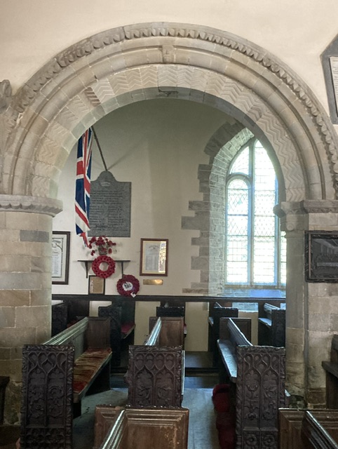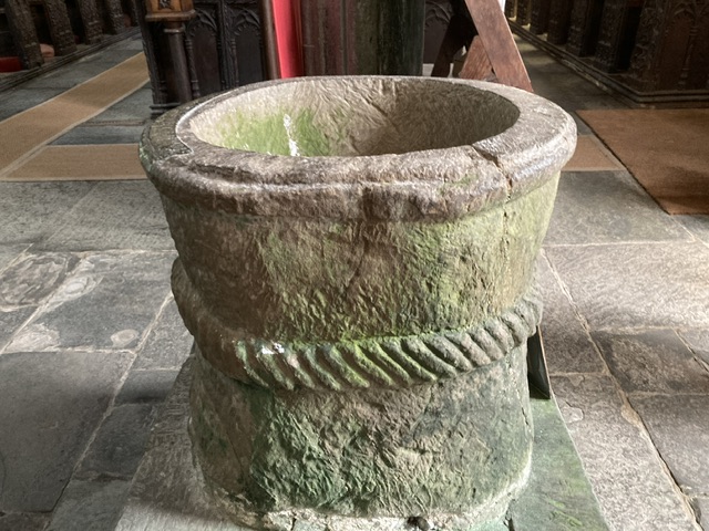 The church has very fine examples of Norman and Romanesque arches in the North aisle arcade; three of which are almost complete semicircles, around eight feet wide, supported by plain circular columns dating from around 1130, made from calcareous dun-stone quarried from the local cliffs. The central arch has unusual beak-head ornamentation with no less than 26 faces carved on it, at three to four inch intervals, in this manner unique to Cornwall, and other styles very occasionally seen in England, south of Yorkshire; rarely in Europe. Reading Abbey, founded in 1121, used this style on a pillar capital; it was not used anywhere later than the end of the twelfth century