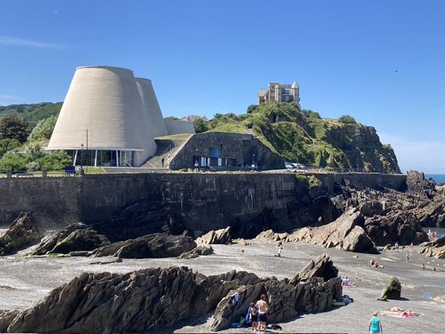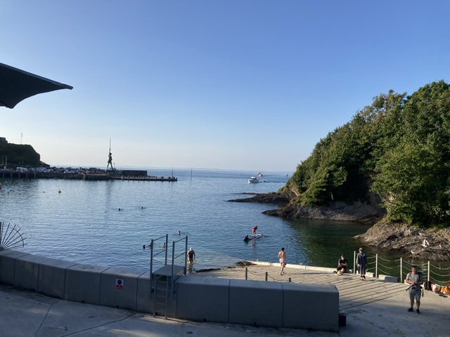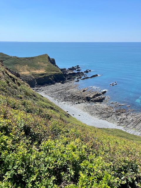 This was the weekend of the third UK heatwave though we were fortunate in having the fresh on-shore wind to keep temperatures bearable. We enjoyed a morning cliff walk when the tide was fully out, revealing large areas of beach and rock of which we had not been aware, as we rounded the hummocks that separate the small bays, beaches and harbour.