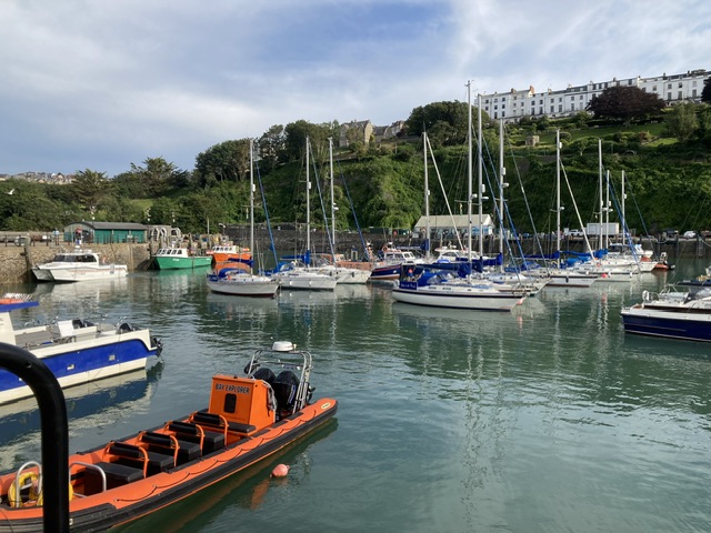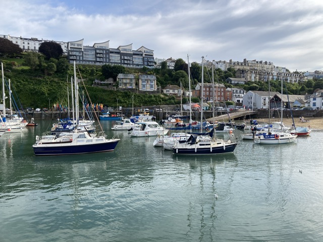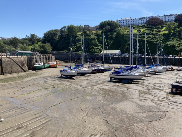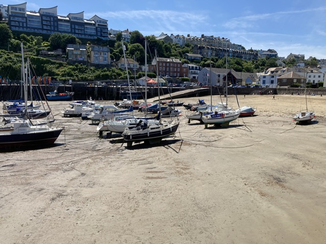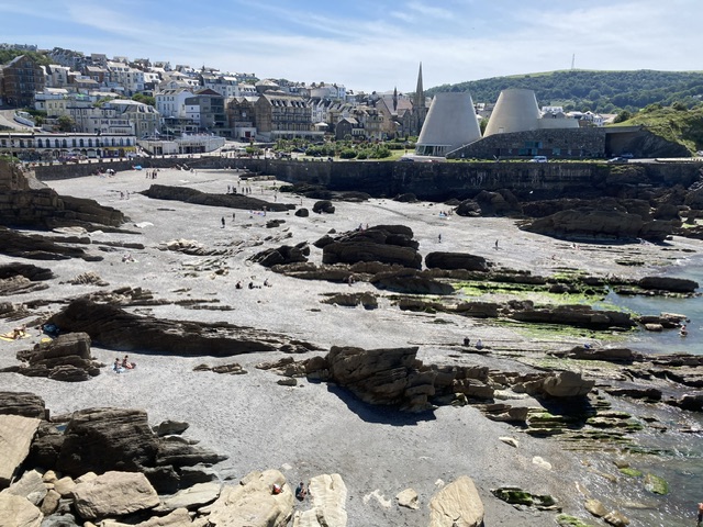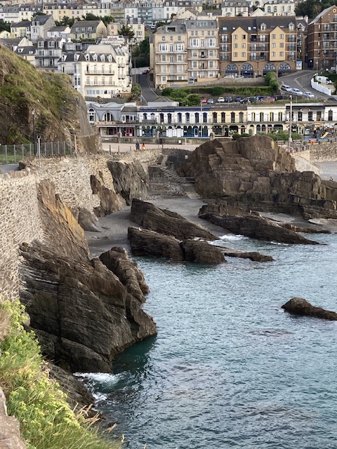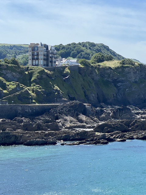 It was very hot, so we headed indoors, to lay low until early evening when we retraced the morning’s walk, to experience the massive variation of sea level at low and now high tide. Notice how the harbour has filled, and the huge rocky beach expanses have disappeared. The Bristol Channel has the greatest contrast between high and low tide heights in the whole of Europe. Ilfracombe’s coast line certainly demonstrates this !