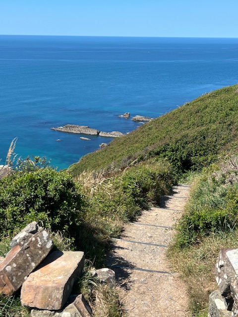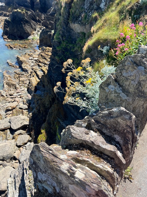 Morwenstow is a fascinating place. Its church was hugely enhanced by an eccentric victorian clergyman – Stephen Hawker – who it is said, composed the earliest Harvest hymns while smoking opium and sitting in a wooden hut he had built on the edge of the nearby cliff. Now in the care of the National Trust, it repaid a visit; fine if vertiginous views; huge empty spaces on the cliff top; wonderful flowers. And still very very hot…