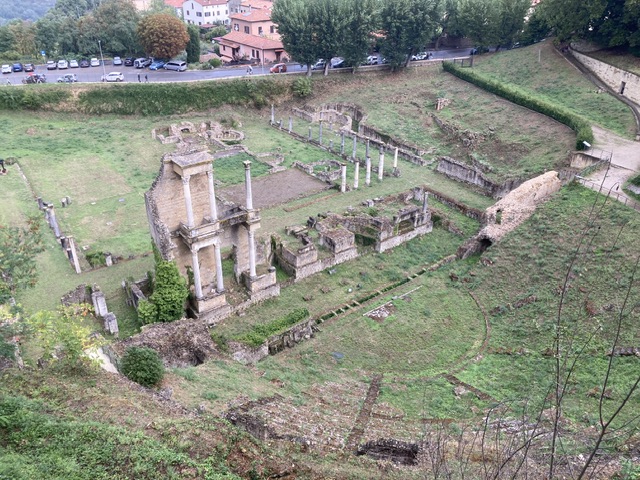 The forecast was for rain, but we managed several explorations on foot, around the existing walls, overlooking the small roman theatre, with spectacular views
