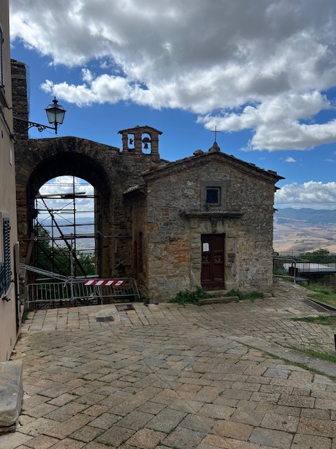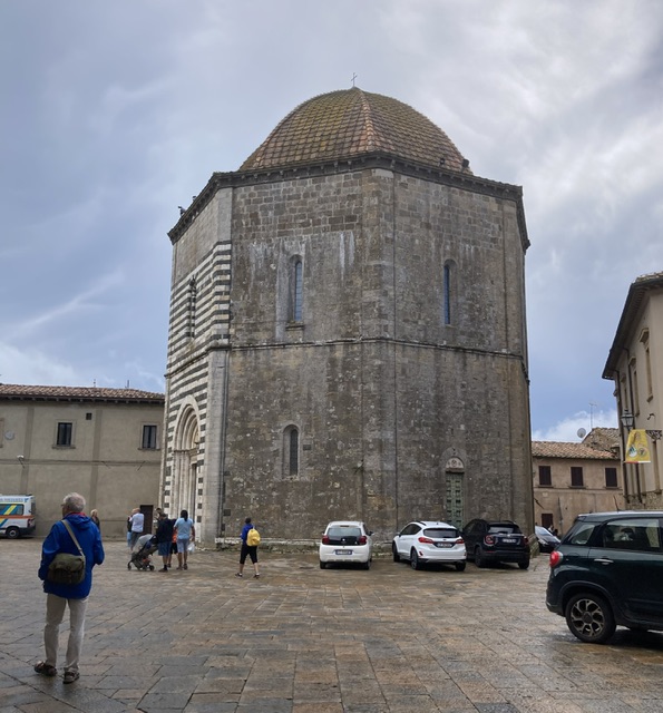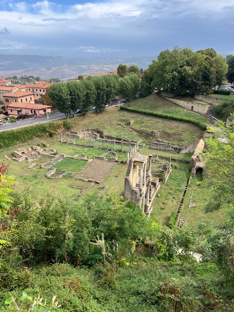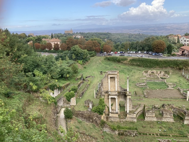 We had walked through the main Piazza dei Priori several times, and ducked into the cathedral and local churches, notably San Lino, and San Francesco both close by the hotel. The views from the walls over the small Roman theatre and baths, north towards the Pisan Hills, west to Pisa and the coast beyond, and east towards Florence made it clear why this ridge has been key to political control, from Etruria in C 10 BCE right through to the twentieth century.