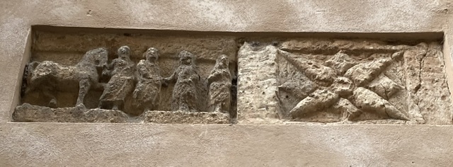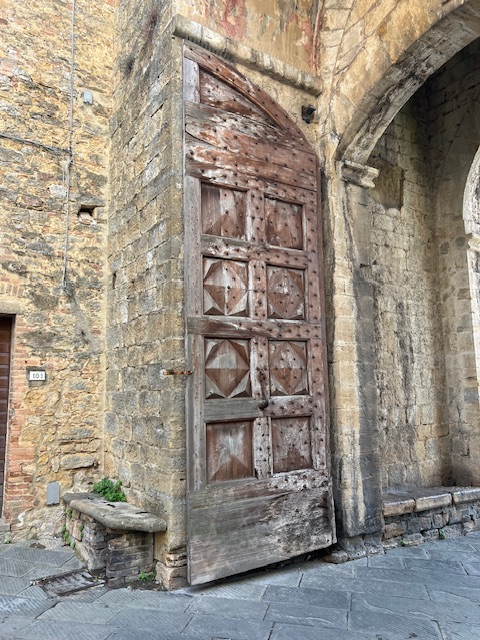 We walked through the town, quite busy with tourists and graced by contemporary sculpture; and caught a glimpse of the more modest Porta Fiorentina and some local street side carvings