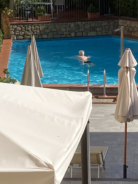 We stayed in the modest San Lino hotel, on the via Roma, at the western end of this formerly Etruscan then Roman, heavily fortified town, at a height of 531m. The Hotel San Lino had been the convent of the third order of St Francis – the Poor Clares, and was converted by three local families in the 1980s, having become derelict some years earlier. A swimming pool now occupies the site of their cloisters, hidden from public view. (Intrepid David braved the rain on Sunday)
