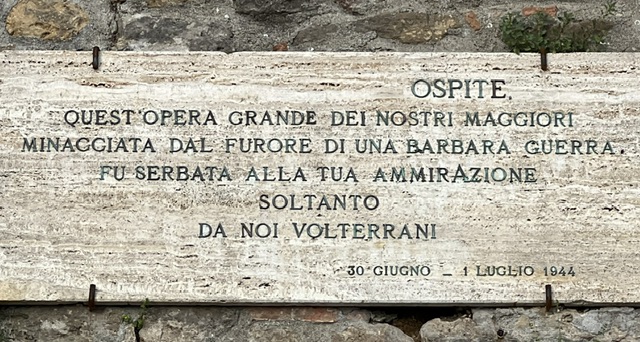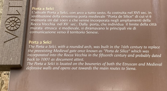 In 1944 the allies entered the city through the Porta a Selci, (not through the Porta All’Arco after all) an etruscan gate rebuilt by the Medicis in the C 16 C just below the Fortezza. This gate is huge, and carries a moving memorial to the 40,000 people who died during internment across Italy, and an acknowledgement of the city’s liberation on 9th July 1944.