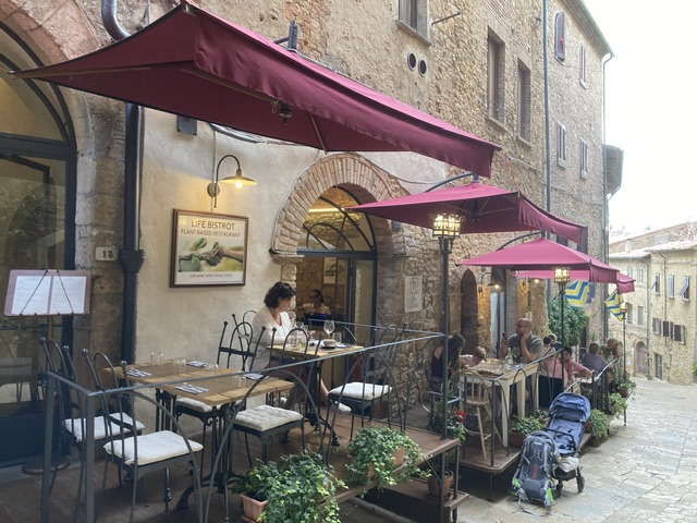 We had a delightful lunch in the excellent Lifebistrot, built over still visible Roman walls and roads, and an Etruscan well, on the steep via Porta All’Arco, before collecting our luggage and heading off to Radda in Chianti, on a sunny, quiet Sunday afternoon.