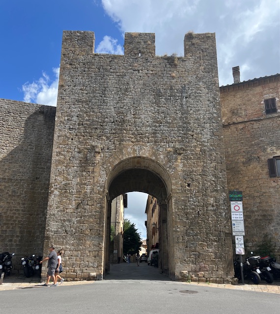 We travelled to Gatwick on the 09.38, arriving in plenty of time for a 14.20 flight – which annoyingly was delayed by an hour. Nonetheless we reached Pisa car hire (Locauto) around 18.30 and headed for Volterra, in a clumsy Jeep, bigger than we would like, and parked in the last white space in the small car park just outside the thirteenth century Porta San Francesco, (or Pisano) through which lay our hotel, inside the limited access area.