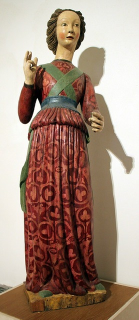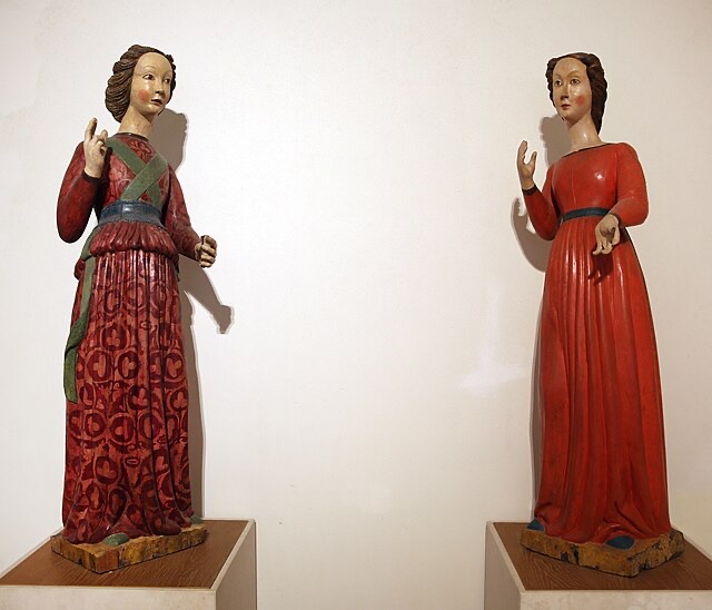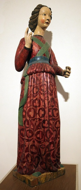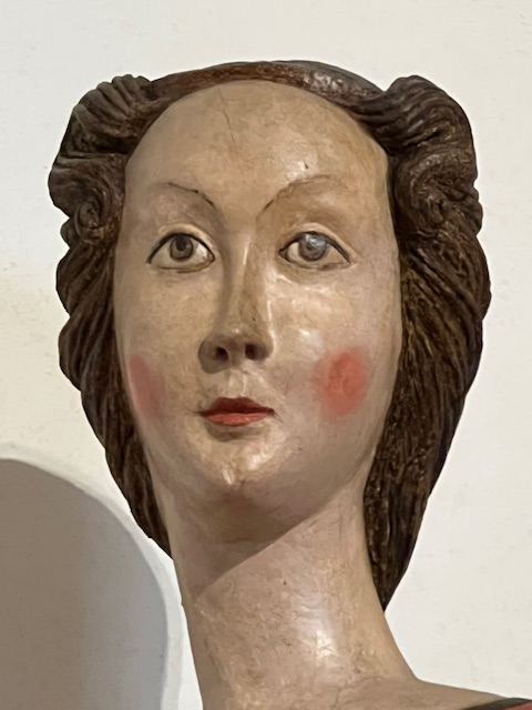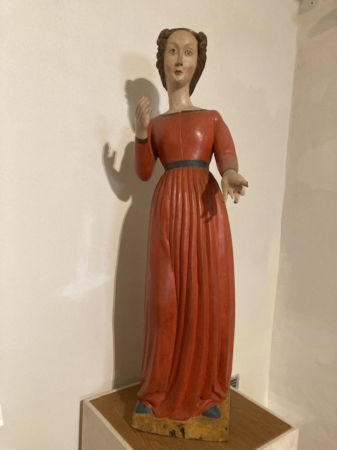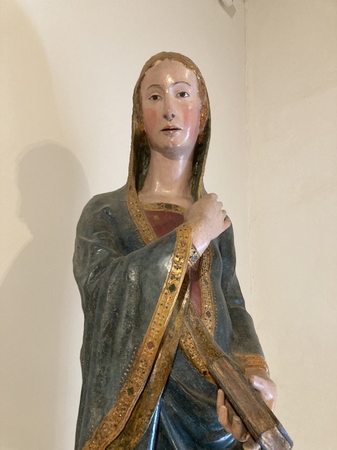 The wooden sculptures were very striking; we were especially moved by the life size treatments of Mary and the Angel of the Annunciation, created by an artist known as the Maestro della Santa Caterina di Alessandria, at some point between 1400 – 1415 for the church of San Simeona a Rocca d’Orcia. Mary wears red, and has such a simple elegance. Extraordinary!