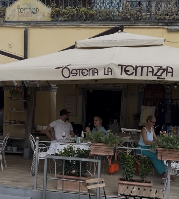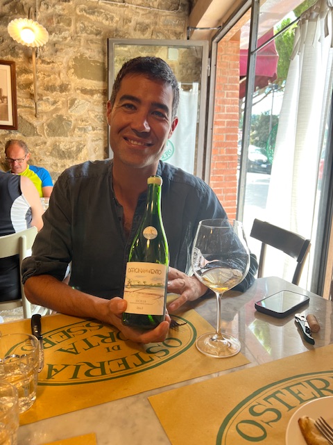 Our next appointment was with Gabriele in the Osteria di Porta al Cassero, a small but very obliging restaurant within sight of the Fortezza and the very large and nearly full carpark below it, where we had parked. And we tasted his newly bottled Sicilian white wine which he and his friends have been busy producing this summer. Having spotted how busy the loo was, I dodged next door to use yesterday’s bar’s facilities, rapidly downing an espresso to establish my credentials there, and to be granted the key!