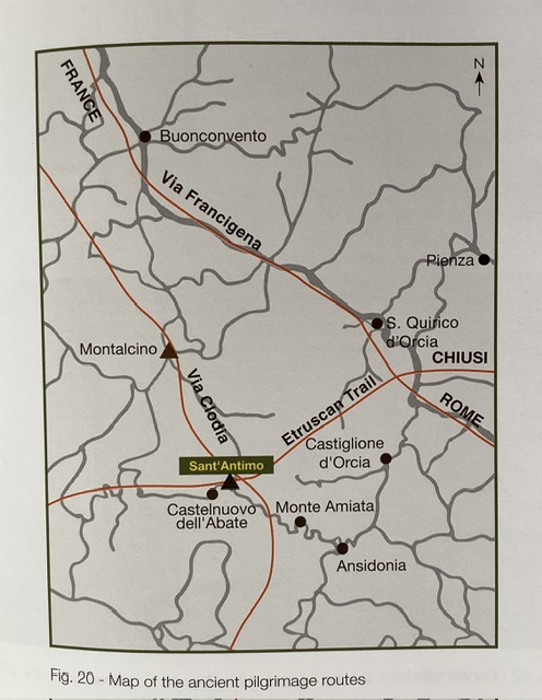 Mastrojanni is very close to Sant’Angelo in Colle, (where many years ago we rendezvoused with two young optimists keen to show us their project, one of whose father had vines from which they planned to make Brunello). I was very keen to revisit the Abadia di Sant’Antimo which has occupied this beautiful site since the time of Charlemagne at the end of the eighth century.