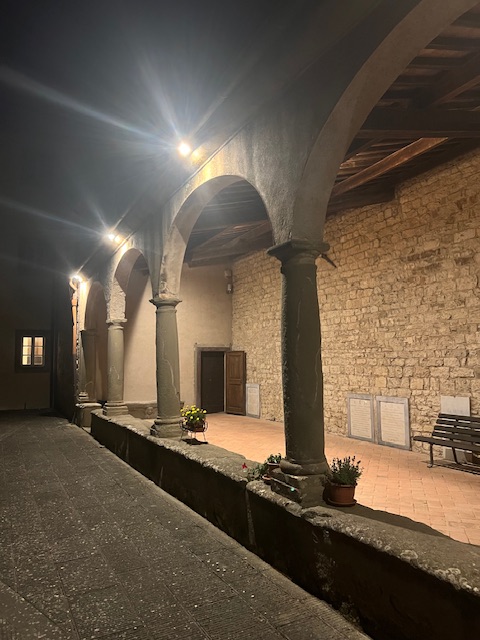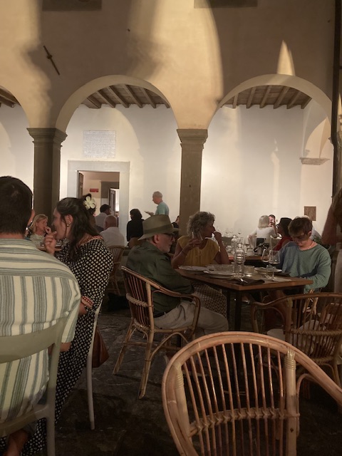 At 18.30 we walked down the hill with Carolyn, passing the crowds of cars to the consorzio do in what had once been a religious house, and entered a very warm and friendly atmosphere. The winemakers were enjoying one another’s company and made us feel welcome in the former cloister as we ate from a generous buffet as well as tasting their wines – albeit in a very small and crowded room.