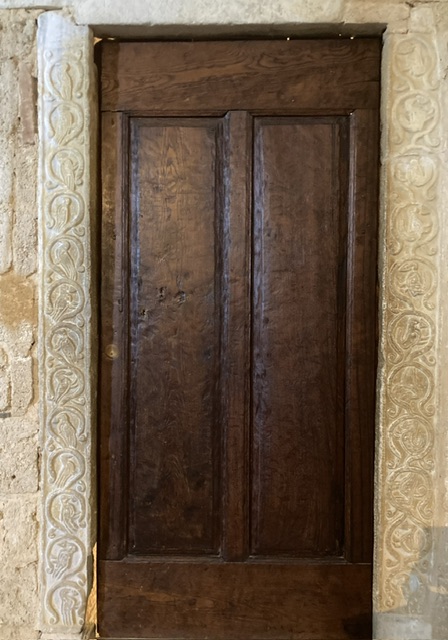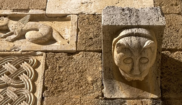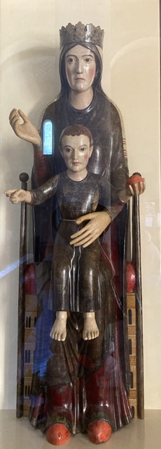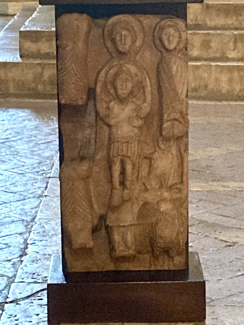 The stonework from its earliest years is astonishing! A very early stone carving of Mary, (below left) the Christ Child and assorted angels, birds and images resembles closely the one (below right) we had seen and photographed in the church of Santa Maria Assunta in nearby San Quirico D’Orcia in 2018.