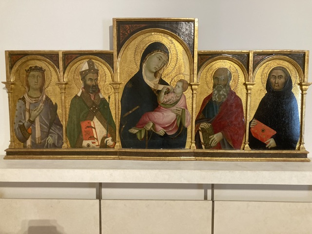 In addition to these remarkable pieces, the gallery had several exhibits originally painted for churches in Montalcino during the first half of the fourteenth century, by Sienese artists of real distinction. These include Ambroglio Lorenzetti, one of the stars of the National Gallery’s recent exhibition: Siena 1300 – 1350 (see my blog piece earlier this year) and more of whose work we were to admire in the Palazzo Pubblico in Siena the next day. (Swipe from right to left on the pics in slide show gallery)