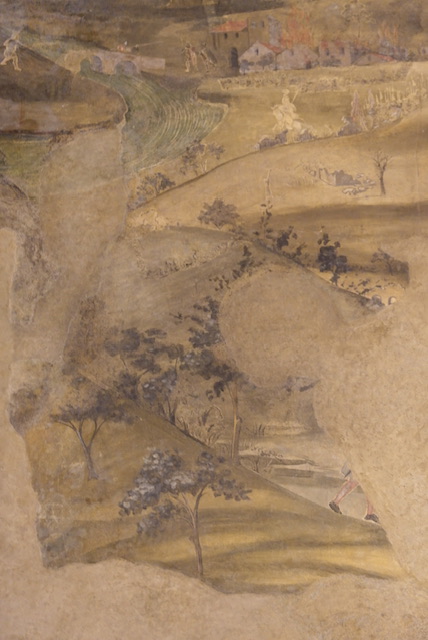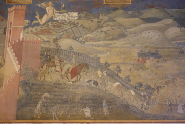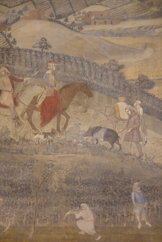 The scenes are breath-taking, and in extraordinarily good repair. The representation of the landscape leading up the orderly road to the gate of the Well-Governed City, painted on the longer wall at right angles to the painting of the court, gives the viewer access to the idealised richness of country life, and offers so many examples of medieval land use.