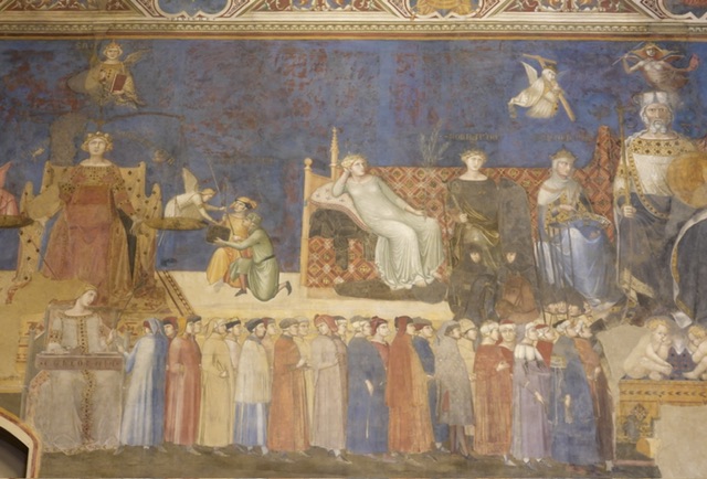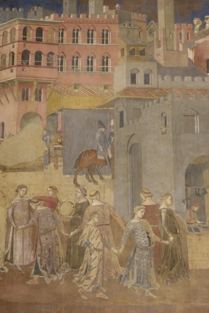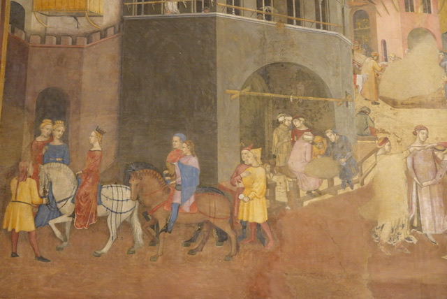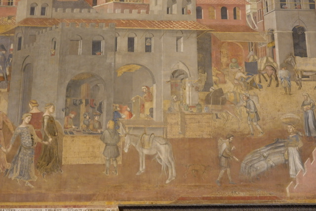 We had a fantastic morning viewing the famous The Well-Governed City painted by Ambroglio Lorenzetti between 1337 and 1340 (as the latin beneath reports) in the Sala della Pace, where the Nine (the governing body) routinely met.