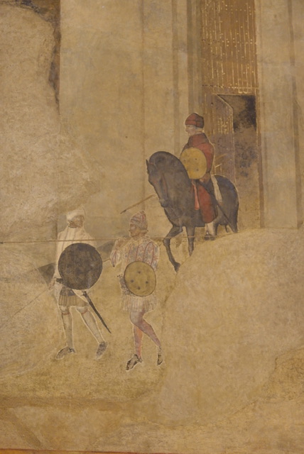 Immediately below the Knight is a newly exposed fresco that pre-existed the Map (below) This somewhat obscured fresco is of a fortress town whose gates are wide open. Some speculate that this commemorates a peace agreement made by the Sienese with Santa Flora fortress in 1331 and its attribution is also questioned; the jury is out.
