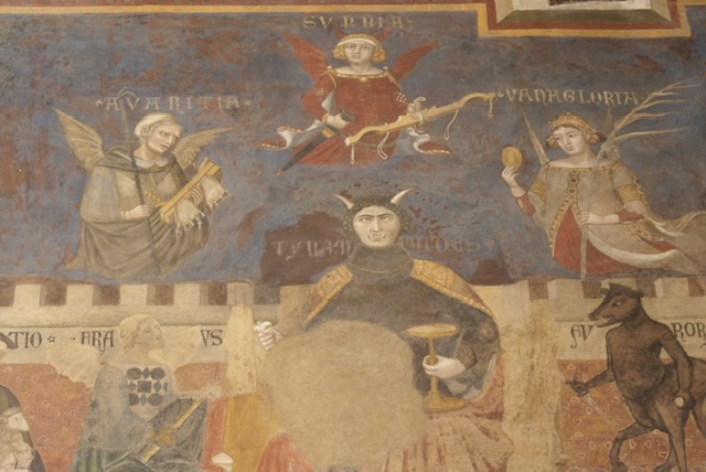 On an adjacent wall is what remains of The Ill-Governed City, also by Ambroglio Lorenzetti. It illustrates the consequences of poor government: violence and hardship, a barren and bleak landscape, presided over a tyrannical demonic figure